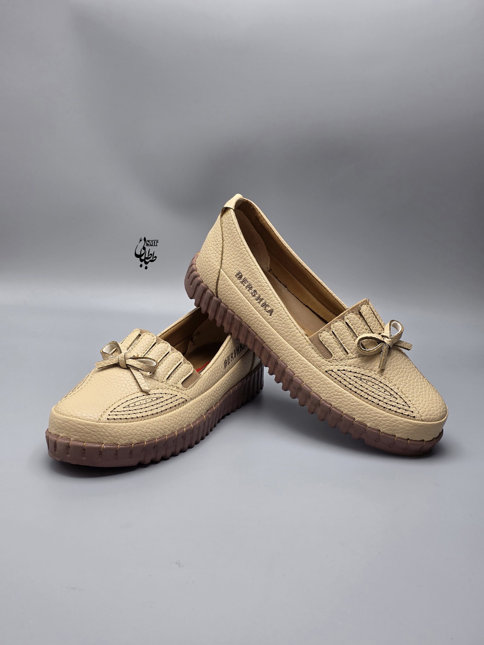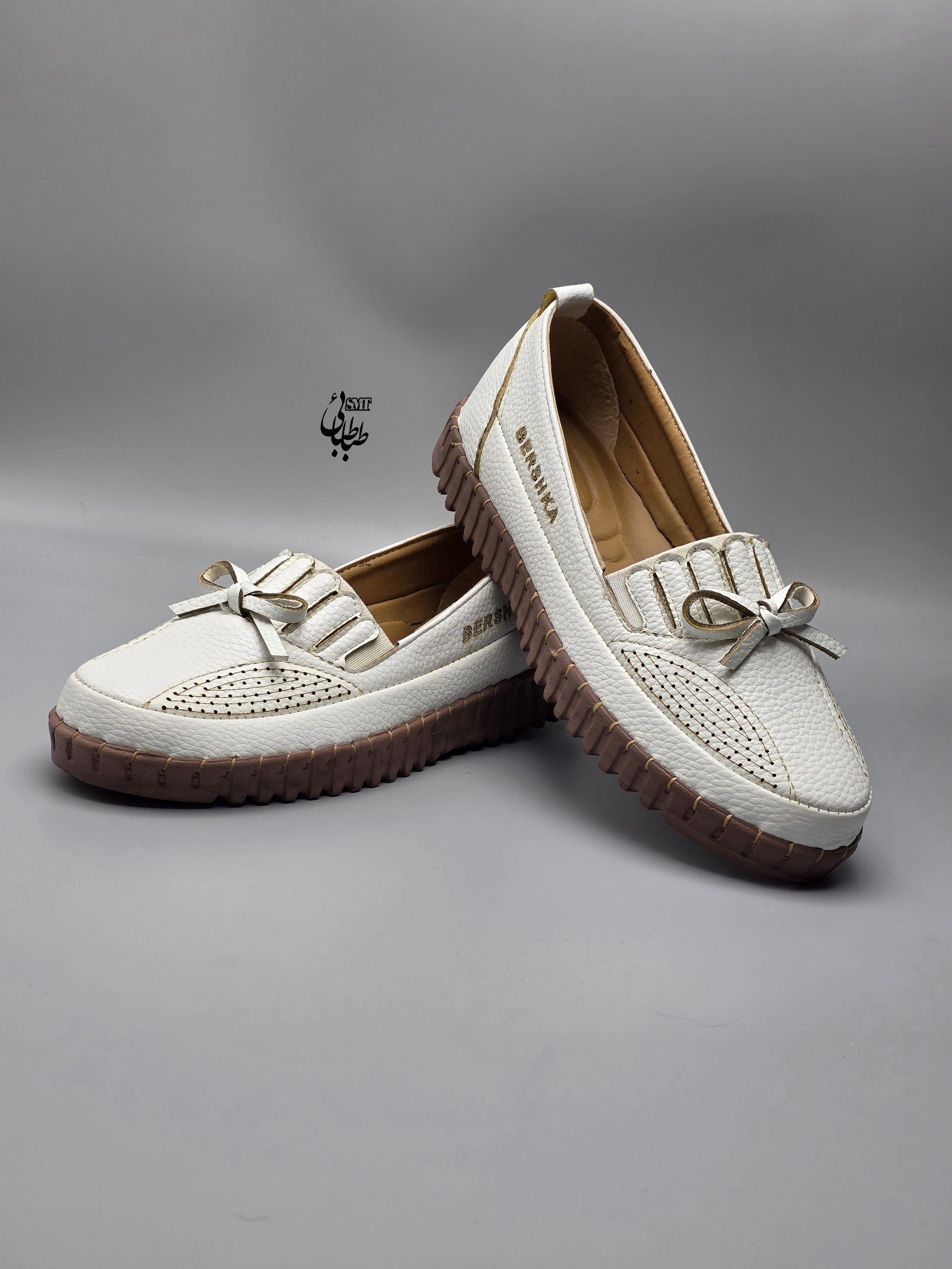 1. رویه تمام لیزر – تهویه و انعطاف فوق العاده: رویه این کفش از چرم صنعتی لیزردار ساخته شده است. طراحی لیزری نه تنها باعث زیبایی و ظرافت ظاهری کفش می شود، بلکه به تهویه ی بهتر و گردش هوای داخلی نیز کمک می کند؛ به لطف برش های لیزری دقیق، این کفش به راحتی با فرم پا منطبق می شود و مانع تعریق یا فشار در نواحی خاص پا می گردد. ویژگی های برجسته رویه لیزر: گردش طبیعی هوا برای جلوگیری از تعریق، انعطاف پذیری بالا و حس راحتی در طول روز، ظاهر خاص و زنانه.
